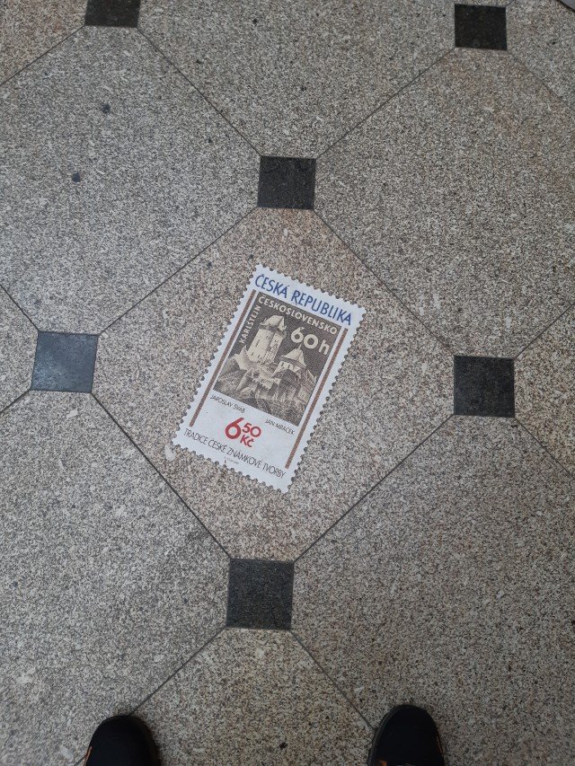 Увійшовши через одну з двох брам з боку вулиці Jindřišská, потрапляєте у внутрішній дворик, де знаходяться віконечка для обслуговування відвідувачів, столики і крамничка. Тут можна за кілька корун купити сувенірні поштівки або марки. Стіни розписані на початку 20 століття на мотиви поштовного і доправного життя-буття) Дах дворику засклений, тут тепло і затишно, і навіть стоять автомати з кавою. Те що треба, коли гуляєш по місту в холодний і вологий день.