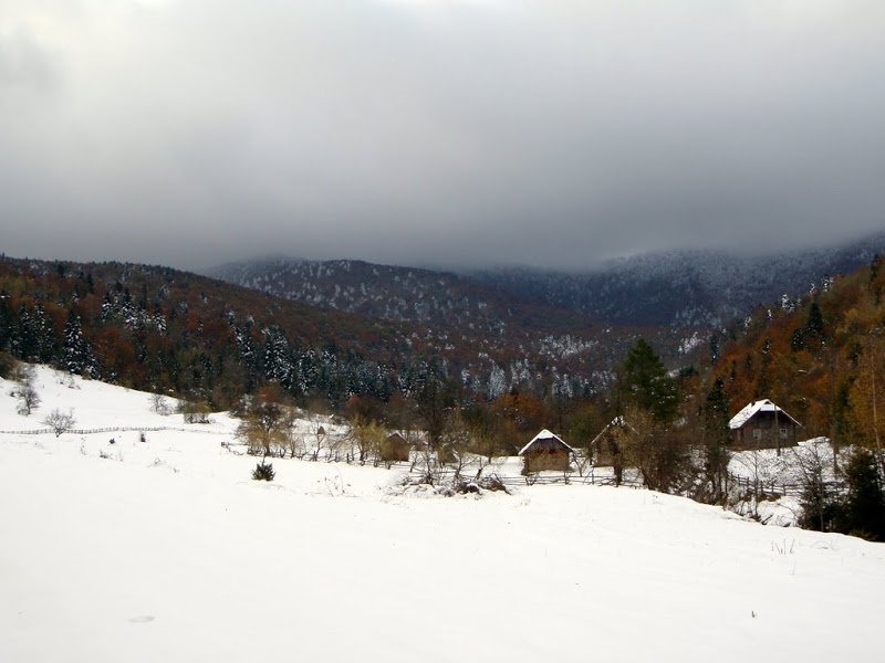 «Йоув, а ви куда ото зібралися. Там же ж ведмідь!», - зустірчає нас місцевий мешканець. «Та ми вашого медвідя рухати не будемо», - відповідаємо йому жартома. Але все насправді значно серйозніше. Прямо коло його хати, якраз там де ми будемо спускатися на снігу видні численні ведмежі сліди. Таааа, село і справді глухе, раз скотина така нахабна, шо не цурається по ньому отак собі розгулювати. Чоловік ніяк не міг повірити, шо ми знаємо куда треба йти і шо ми подолаємо цей маршрут до темноти. «Та там снігом всьо придавило, гілки поламало по дорозі взагалі не можна йти!» Заспокоюємо його шо в нас є і досвід, і спорядження та й ідемо далі.