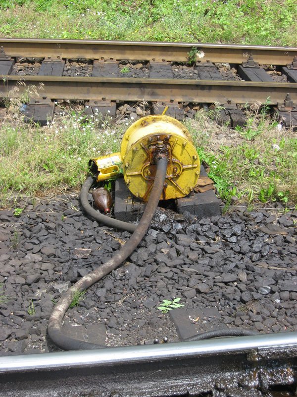 1. Знаходиться на території станції Рясне. Можна здогадатися, що в кожуху шестерінчастий насос. Привод відсутній. Можливо, пристрій призначений для змащування колії: