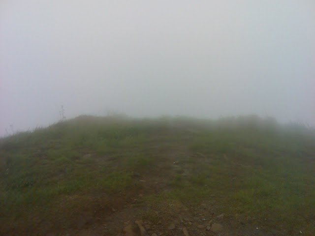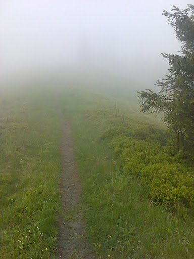 йду далі, стараюсь час від часу бігти... "голубятьня! Пля, а тепер слухай мою команду! Вгору!!!" йдуть-йдуть, але дуже повільно... ну ще трішки лишилося... за кожним пагорбом намагаюсь видивитись хрест...фіг там все в тумані!!! "Де той хрест???" ... бойовий дух починає... ноги щораз менше слухаються... знову спуск..."та скільки можна???!!", вже підкрадаються різні думки..." може я його пропустив??? ото було б сміху..."