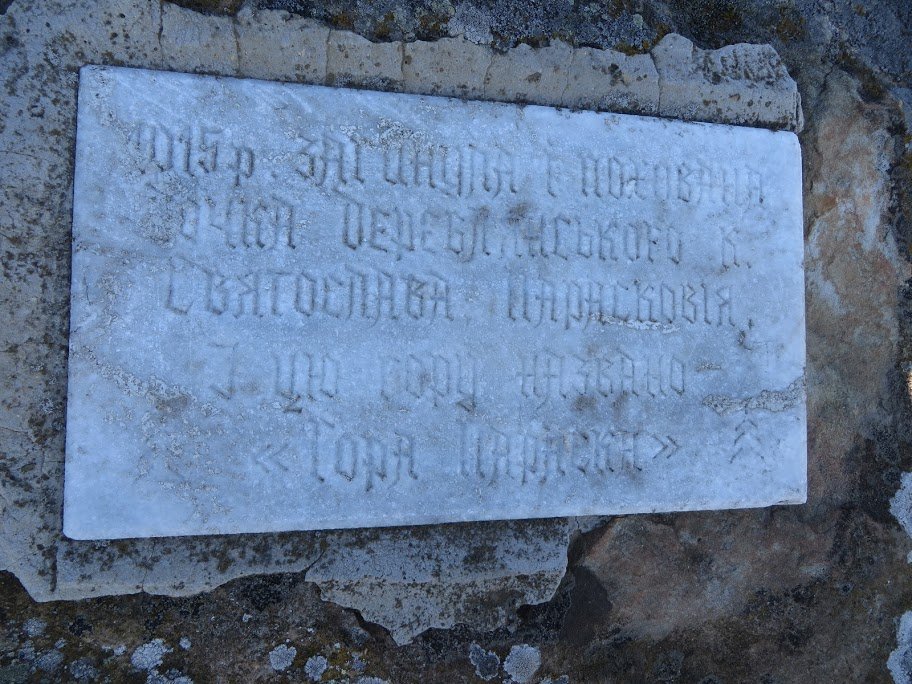 Мармурова табличка врізана в камінь. Сказано: 1015р. загинула і похована дочка Деревлянського князя Святослава Парасковія, і цю гору названо в її честь.