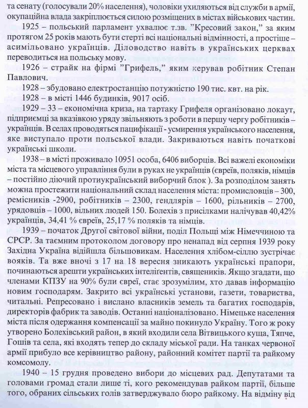 ...Серцем кожного міста є ратуша. Болехів має невеличке і на вигляд дуже крихке серденько. Його ратуша одноповерхова і навіть разом з годинниковою вежею тільки трохи вища за сусідню кам'яницю і ніяк не дотягується до куполів церкви та дзвіниці, що стоять поруч. У післявоєнні роки Болехів переніс кілька "операцій на серці": ратушу переобладнували під штаб полку НКВД, міську поліклініку, різьбярську майстерню, так званий музей Брежнєва. Лише наприкінці 1992 року тут знову з'явився магістрат. Недавно при вході в міську раду всілися два помальованих бронзовою фарбою леви. Напевно, будуть охороняти серце свого містечка.