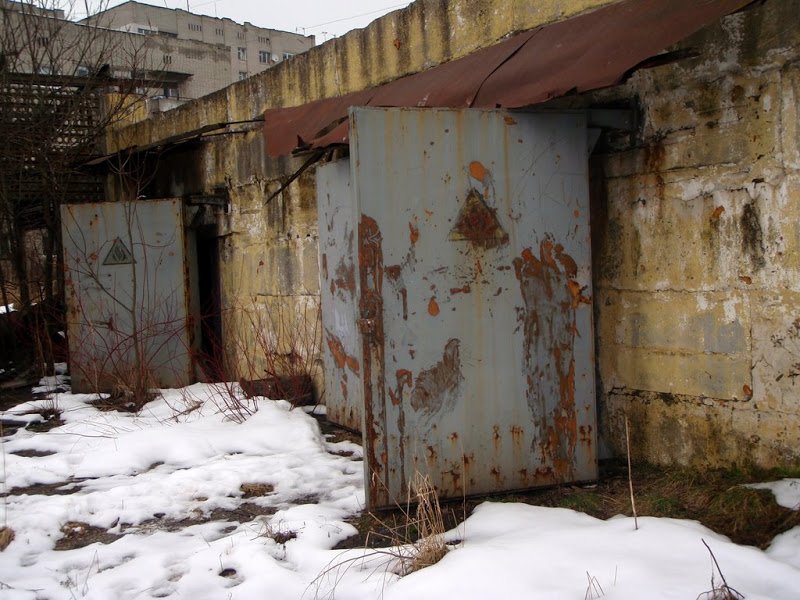 Шо ше цікаве в парку - викорчуваний бомбік. Шо не зробили американські ракети - вдалосі нашим вуйкам. Вентиляційна шахта стоїть перевернута збоку, а на місці бомбіка велика яма. Виходимо на Любінську та не втримуємся від спокуси побувати на закинутій ракетній частині. Тим більше шо за Словами Романа там ніхто нічого вже не охороняє. А й справді - в паркані сіяють великі дирки, всередину протоптана широка стежка. Повз закинуту вишку попадаємо на великий пустий пляц. Збоку в горбі два ангари, напевно колись було якесь пальне. Бо і двері надзвичайно товсті, та й стеля зроблена не з дошок як в наступних ангарах. Йдемо далі. Майже всі будівлі на правій стороні спалені, стоять одні каркаси. Зато на іншій стороні все гарно збереглося. Переходимо колію, звертаємо увагу на дріт шо стелиться по землі повз неї. Фіг його знає, може це і сигналізація периметру, а може і якийсь телефонний звязок. Я схиляюся до першої версії, бо недовго ми ходили по тих складах, як прийшли люди в формі і випровадили нас геть. Але ше до цього ми встигнули оглянути кілька з них, досхочу начитатися колись секретних описів деталей парашутної тормозної системи, порозглядати самі залишки деталей.
